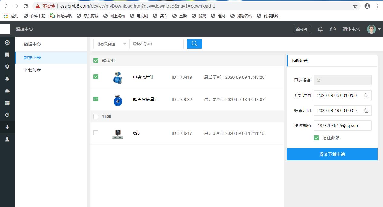 点击左侧“数据中心”可以下载设备数据到邮箱