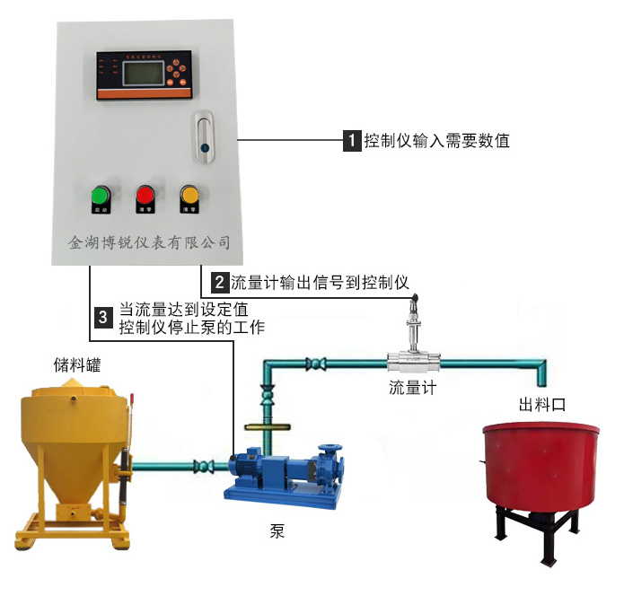 ②、定量控制仪具开关量信号输出,当设定好定量值,仪表根据流量传感器反馈的流量信号,当达到设定值后,自动关闭泵或阀门。